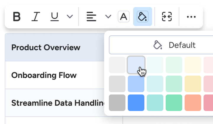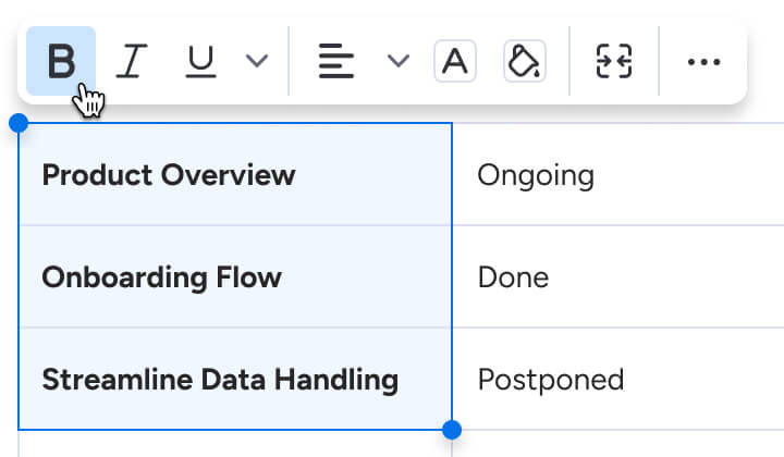 Drag handles now appear only on hover, reducing visual clutter. We introduced multi-cell selection with a new contextual menu for formatting, background color, and merging cells. Enhanced copy/paste logic and new keyboard shortcuts significantly improve usability and accessibility.