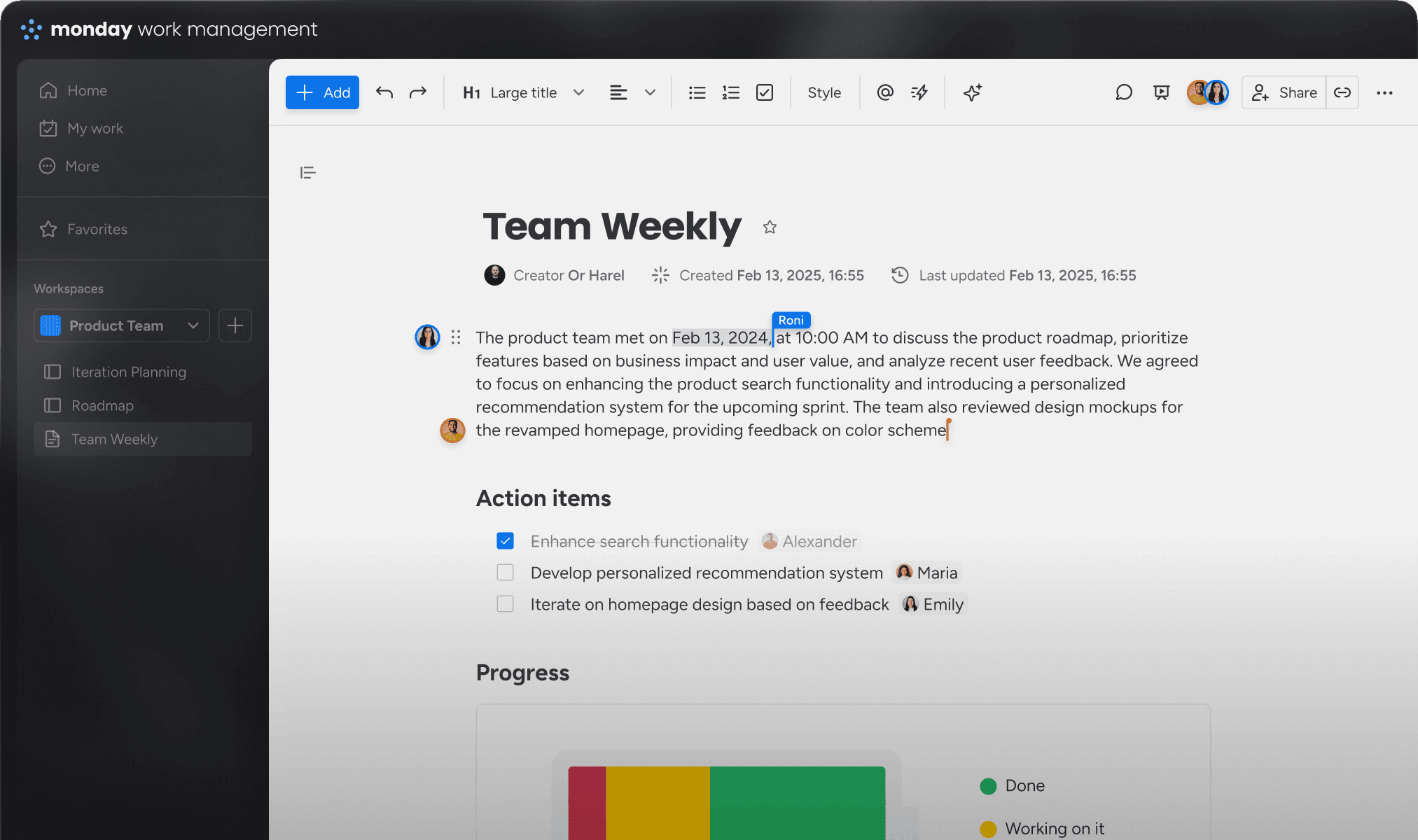 Monday Docs is a collaborative documents editor that live within the monday.com platform — designed to help teams centralize information and streamline workflows by providing a space to create, edit, and share documents alongside their tasks and projects.