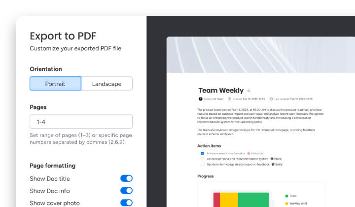 Export to PDF was transformed for reliability and control. It now fully supports all content (blocks, images, tables) with interactive links, ensuring exports mirror the editor. Users get feedback on unsupported items and more control via a new modal with preview, settings (like page orientation, numbering), and a dedicated Page Break block.